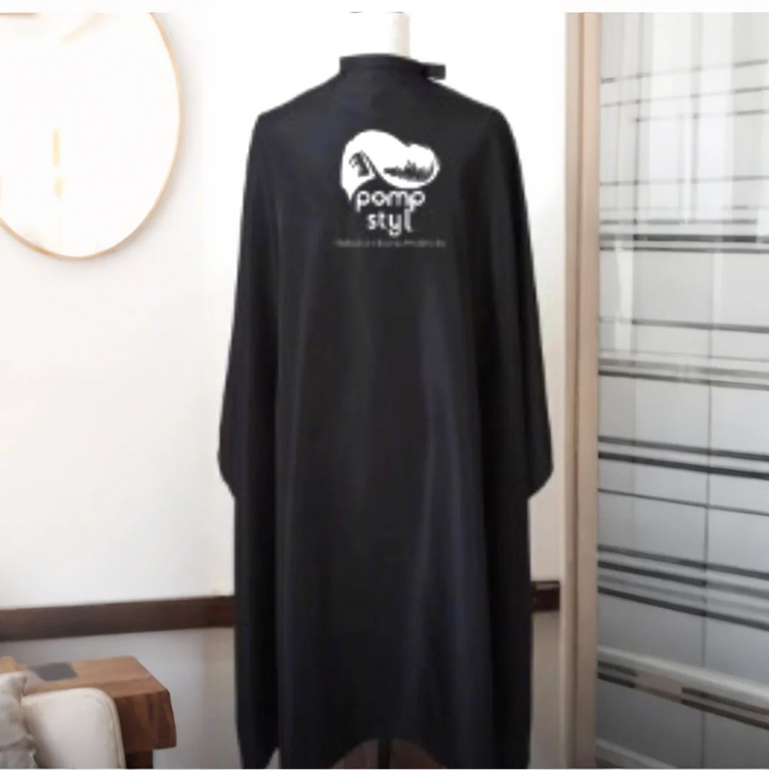 This is a high-quality, professional Barber Cape designed for use in barbershops and salons. Made from durable, lightweight material, it is perfect for protecting clients' clothing during haircuts, shaves, or styling. The cape is white in color with a sleek black collar and features a logo in the center, adding a modern touch to its design. It is large enough to cover the shoulders and upper body, ensuring comfort and convenience for both the client and the stylist. The adjustable neck closure ensures a secure fit for clients of various sizes. This cape is easy to clean and maintain, making it an essential accessory for any salon or barbershop.